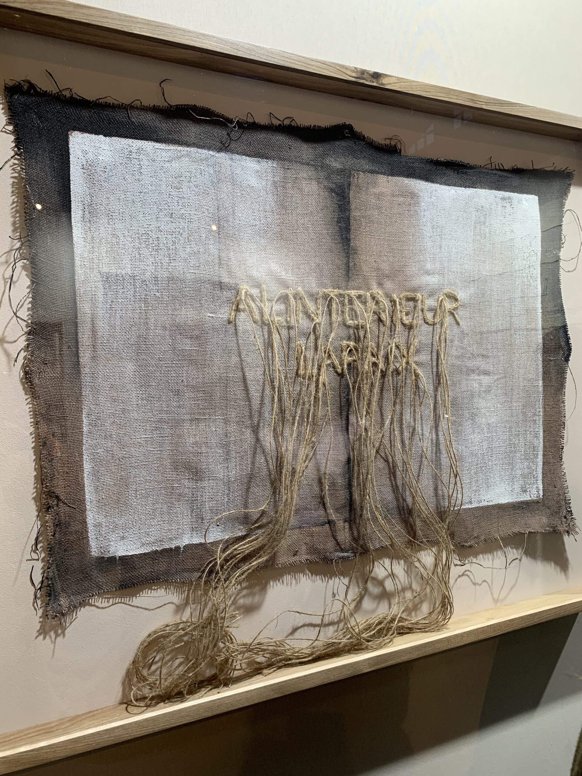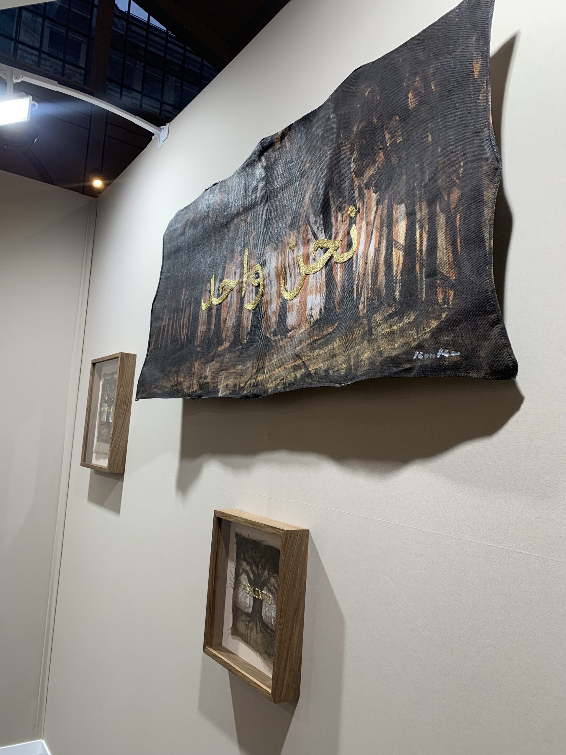 Le mot « REPARER » apparaissait de manière récurrente sur les œuvres textiles, brodé en lettres grasses qui transformaient l’acte de raccommoder en mantra visuel. Plusieurs pièces ont été réalisées en collaboration avec la coopérative de brodeuses Tazert au Maroc, intégrant directement le savoir artisanal dans l’œuvre d’art. La transmission des connaissances rendue visible.
