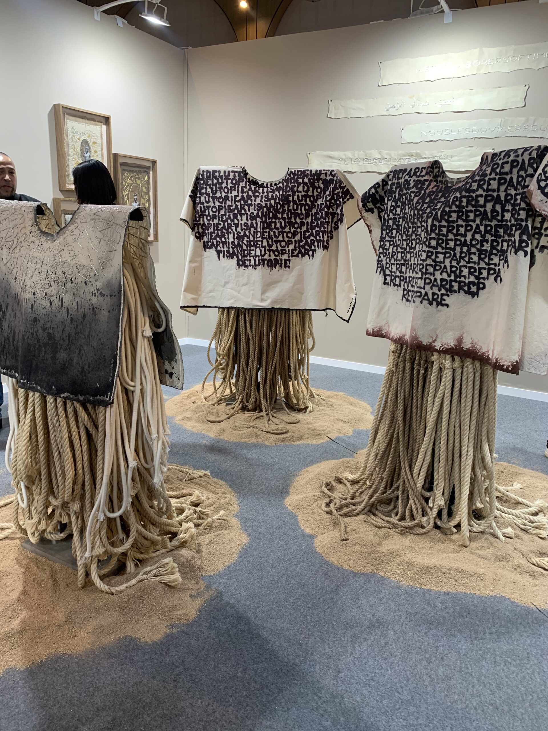 L’installation monumentale de Serge Mouangue, présentée par la galerie tokyoïte Un, accueillait les visiteurs dans l’allée centrale. Cette mise en scène sculpturale inédite proposait un langage visuel marqué par la lenteur, le rythme et le silence.
